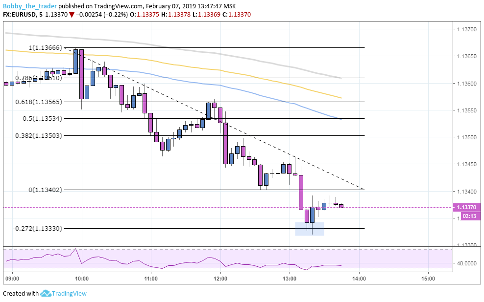 Есть уровень (в данном случае только фиба), к нему подходит цена, делает небольшой откатик и затем идет ниже, в общем образовывается дивер. Далее важно (лично у меня), чтобы из этих первых откатных свечек не получилось зеленой (в моем случае синей) на 5м, т е у вас идет заполнение тени на 5м (чуток прострел, не важно). Далее либо улетает (что чаще всего, как обычно бывает), либо может быть повторное движение (маленький откат и дальше вниз), тут уже по-разному, но можно минуты на 3 зайти (в первом случае кстати тоже), возможно уровень запиливается и мы там больше ничего не делаем, может еще один дивер и потом отлетит. Исключительно этот момент по статистике не наблюдал (этот элемент в общей находится), но на памяти в основном этот вход дает профит, когда первый не удачно закрылся, или ты первый вход (от уровня) возможно не успел взять, или тебе не особо нравится движение, импульсы там или еще что, а вот когда формируется такая тема, чаще всего импульс уже затух и будет обратное движение. (Щас бы памяти верить...)