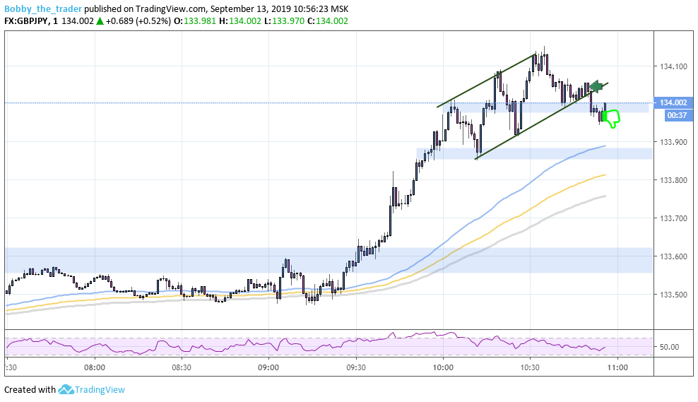 Тут тоже красиво. Долго бились об поддержку. В итоге подошли, так красиво набрали силу (последняя мини волна) и пробой. Далее откат и вход