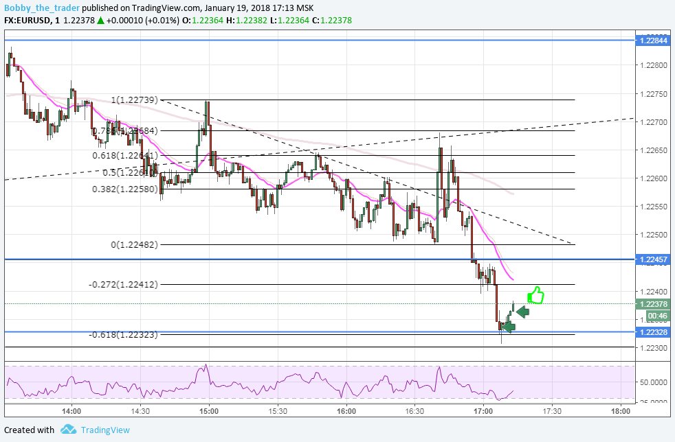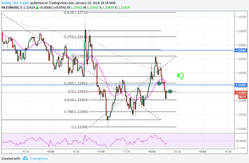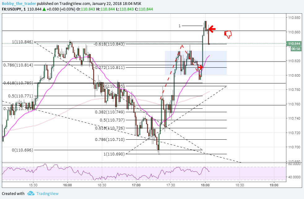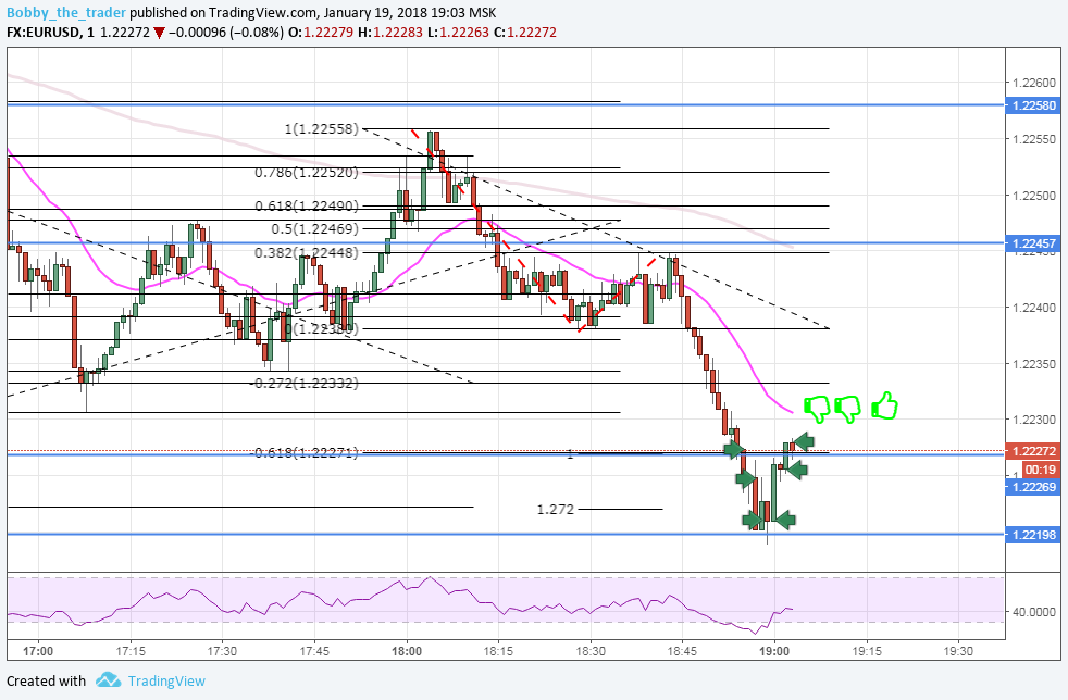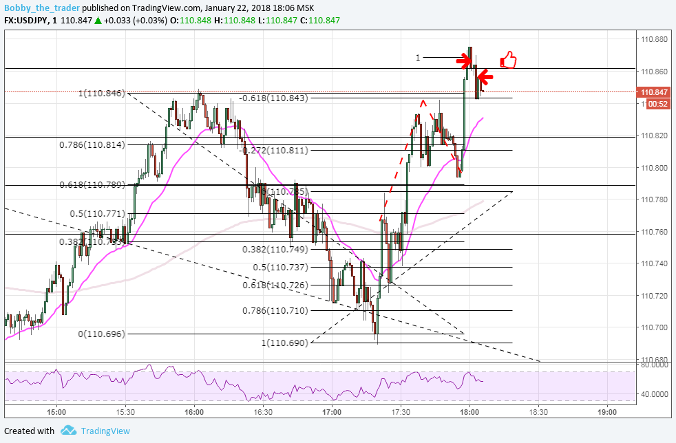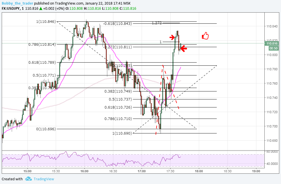 1 вход: Вход сделан не по правилам и я его придумал. Во-первых, я стараюсь чертить ФМ по откату до 0.618 либо через две волны. Здесь же я прочертил его через одну волну с откатом 0.382. Добавил себе уверенности расширением (1) и уровнем (кстати он не плох). Самое глупое то, что я 1) Вошел на закрытие часа. 2) Предполагал, что с тенью за уровнем закроется и пожадничал. Молодец, чо )